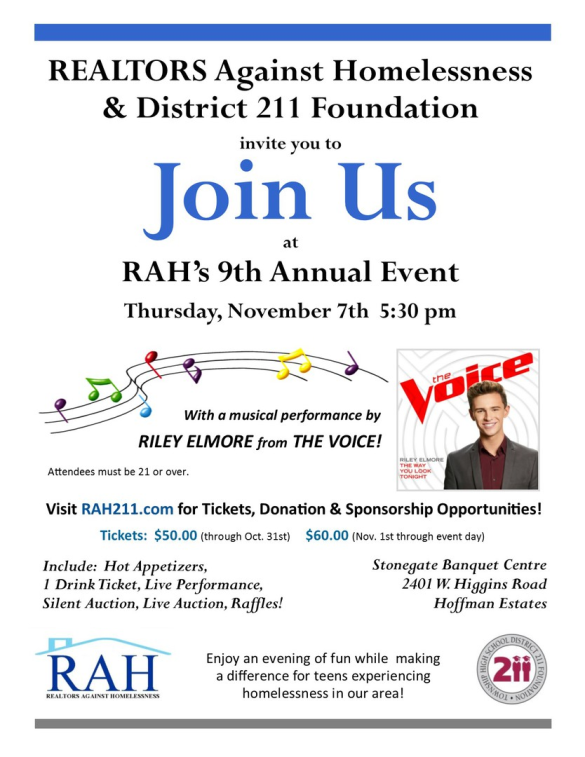 Tickets include admission, 1 drink ticket, hot appetizers, live auction, silent auction, raffles, and live performance by Riley Elmore from The Voice!